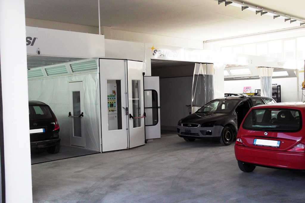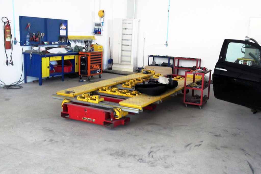 Banco riscontro con dima universale; cabina verniciatura; 3 aree di preparazione.