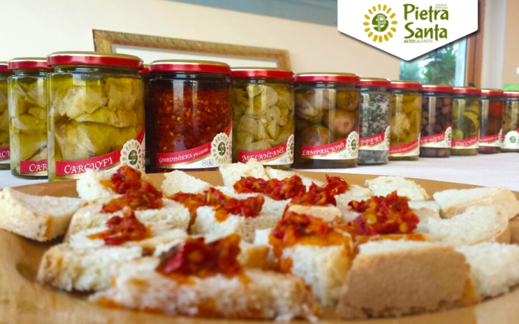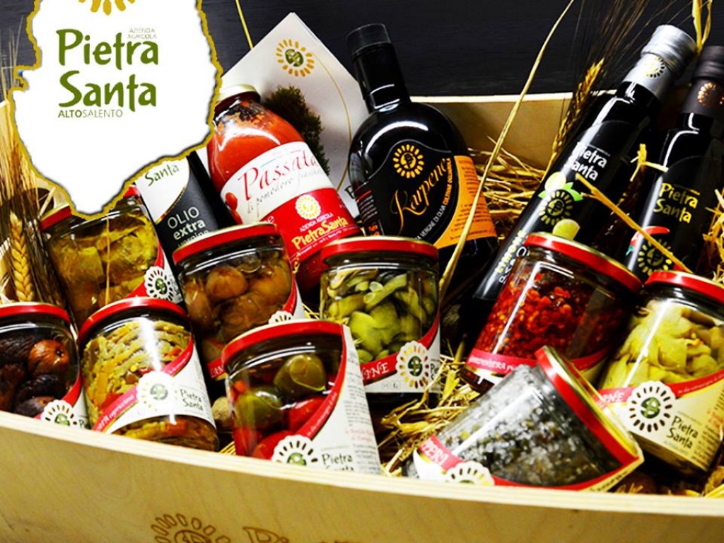 PRODOTTI TIPICI PUGLIESI "PIETRASANTA": tra la gamma dei nostri prodotti tipici pugliesi online (in conversione verso l'agricoltura biologica), tutti esclusivamente lavorati come la tradizione tramanda, assolutamente al naturale, senza nessun tipo di conservante, ci sono: la passata di pomodoro fiaschetto, i fichi secchi mandorlati, olive verdi e olive nere in salamoia, i capperi sotto sale e i prodotti sott'olio come i lampascioni, i carciofini, le melanzane, gli involtini di melanzane e i peperoncini ripieni con tonno e capperi, la giardiniera piccante, l'insalata capricciosa; tutti prodotti rigorosamente di nostra coltivazione, lavorati a mano con sale e aceto e conservati in olio extravergine di oliva.